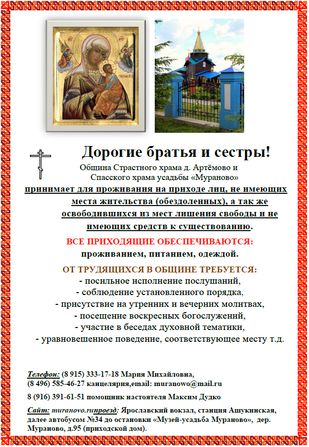 Община принимает для проживания на приходе лиц, не имеющих места жительства (обездоленных), а так же освободившихся из мест лишения свободы и не имеющих средств к существованию. ВСЕ