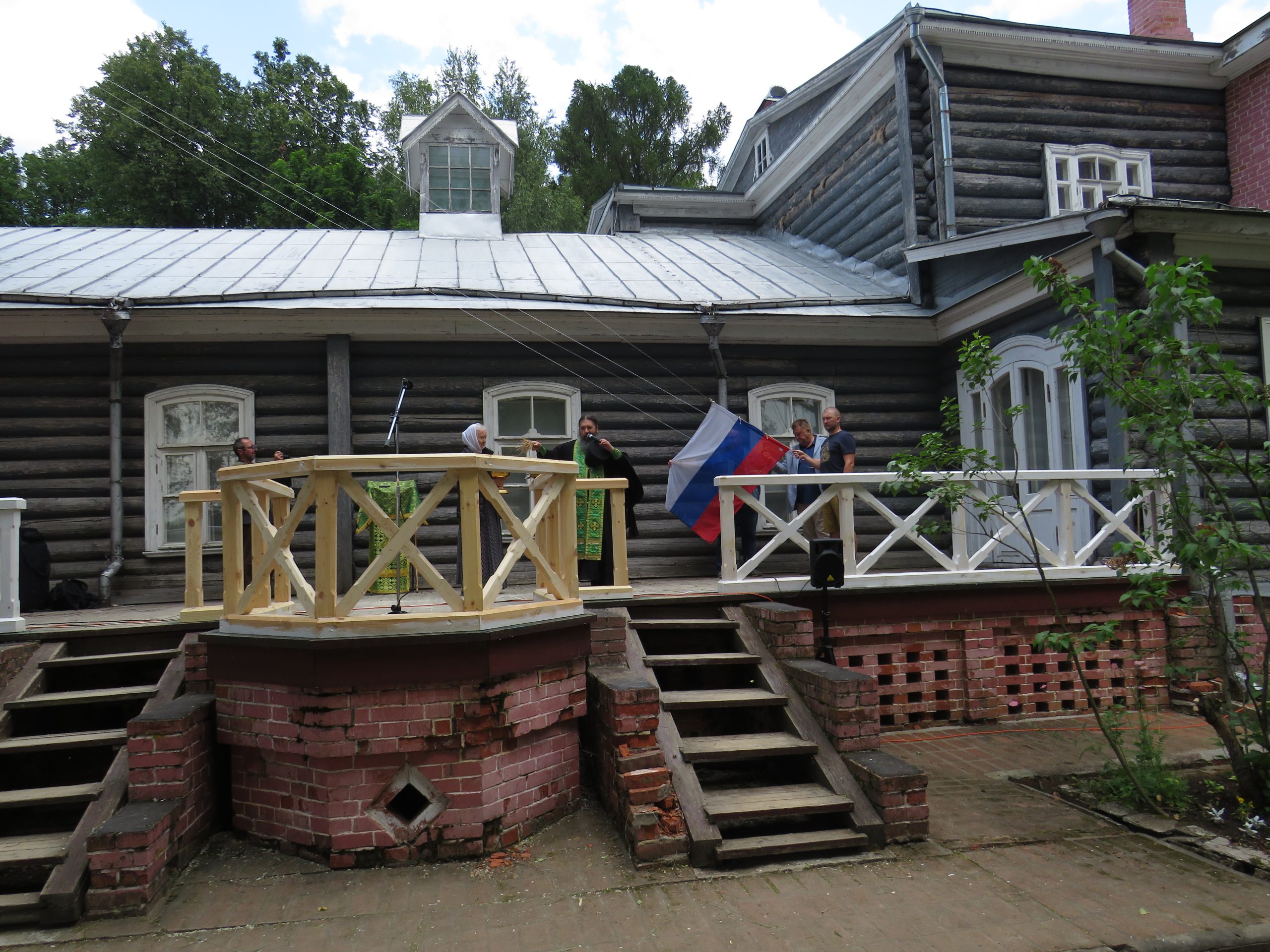 С поздравительными словами выступили: и.о. директора И. В. Бишкин потомок поэта Тютчева В. Е. Бегинин и настоятель Спасского усадебного храма игумен Феофан (Замесов). Обращаясь к участникам мероприятия, священник отметил, что Россия является той силой, которая препятствует злу восторжествовать в мире. И призвал всех не забывать благодарить Бога за то, что мы живем на русской земле. Затем отец Феофан отслужил праздничный молебен и окропил флаг. Митинг завершился церемонией поднятия Российского флага на флагшток башни Главного усадебного дома. >>