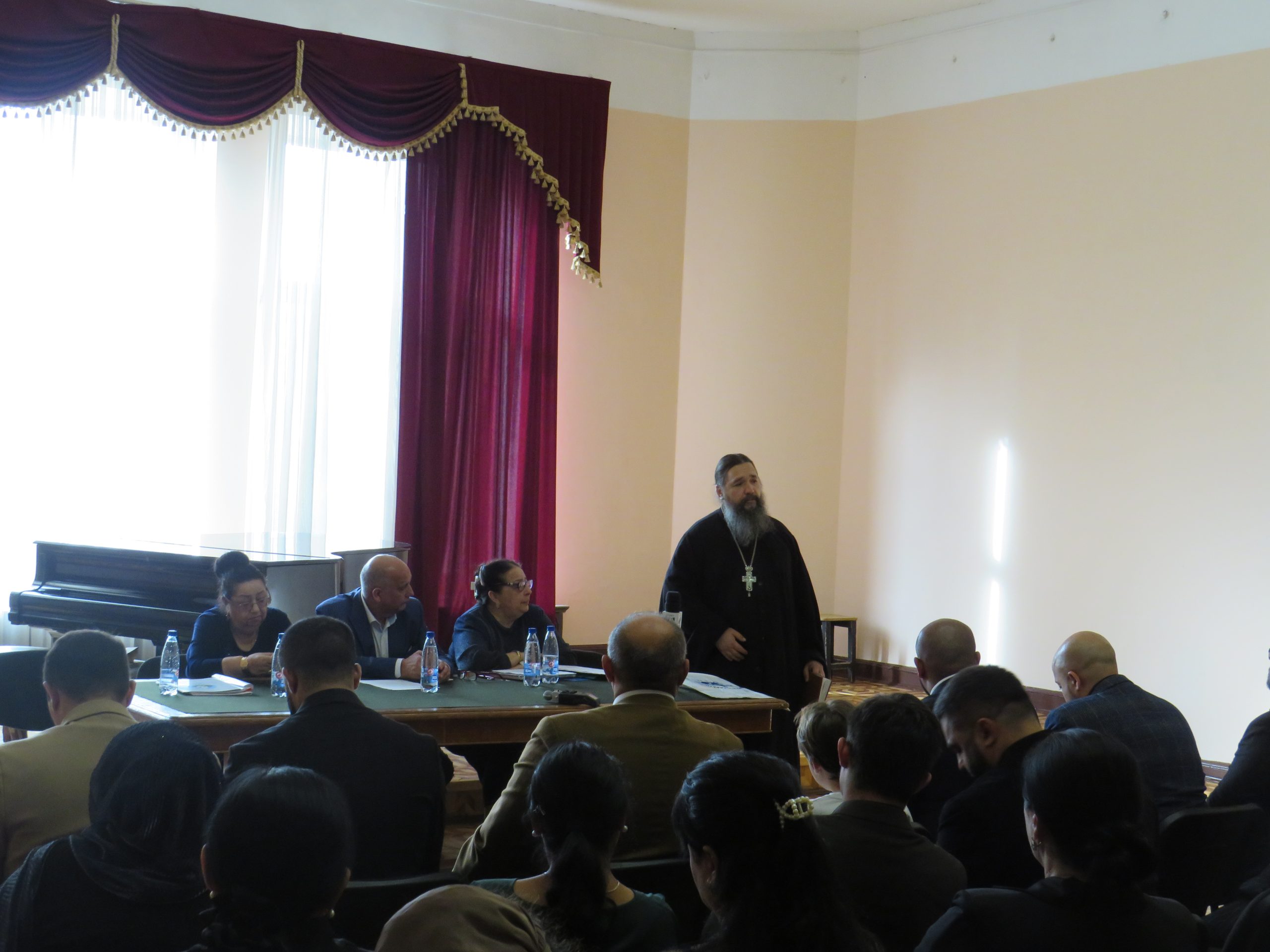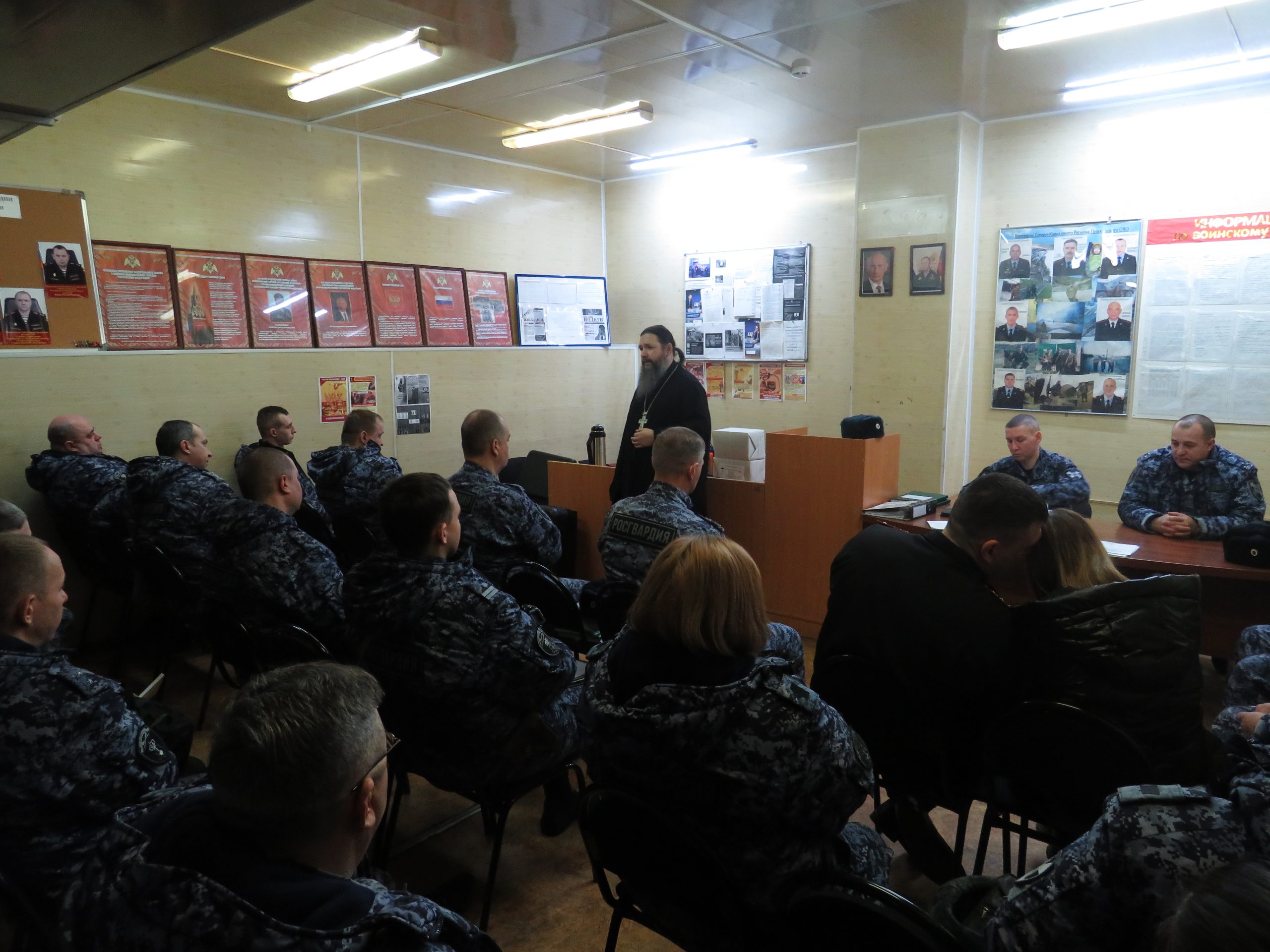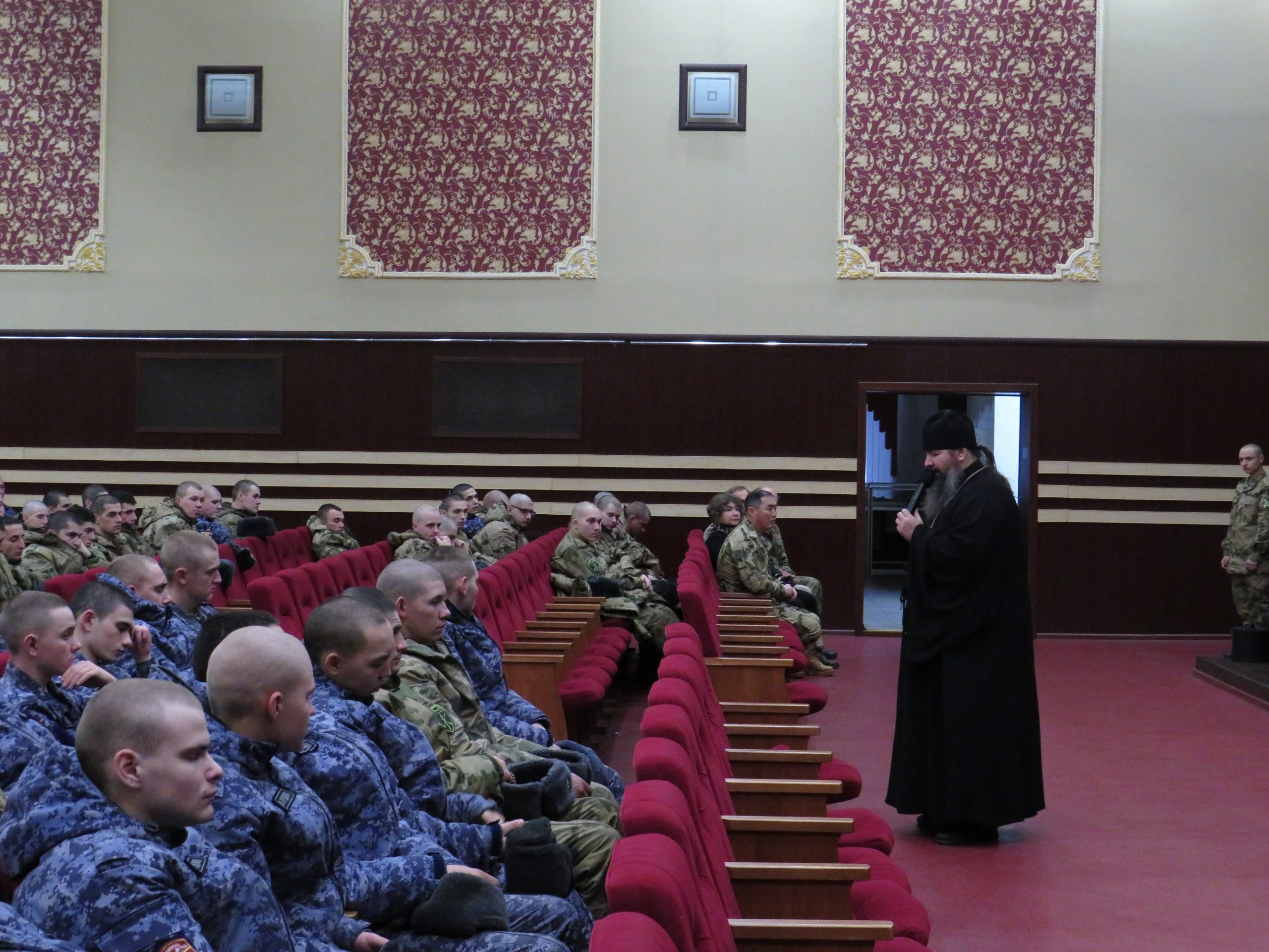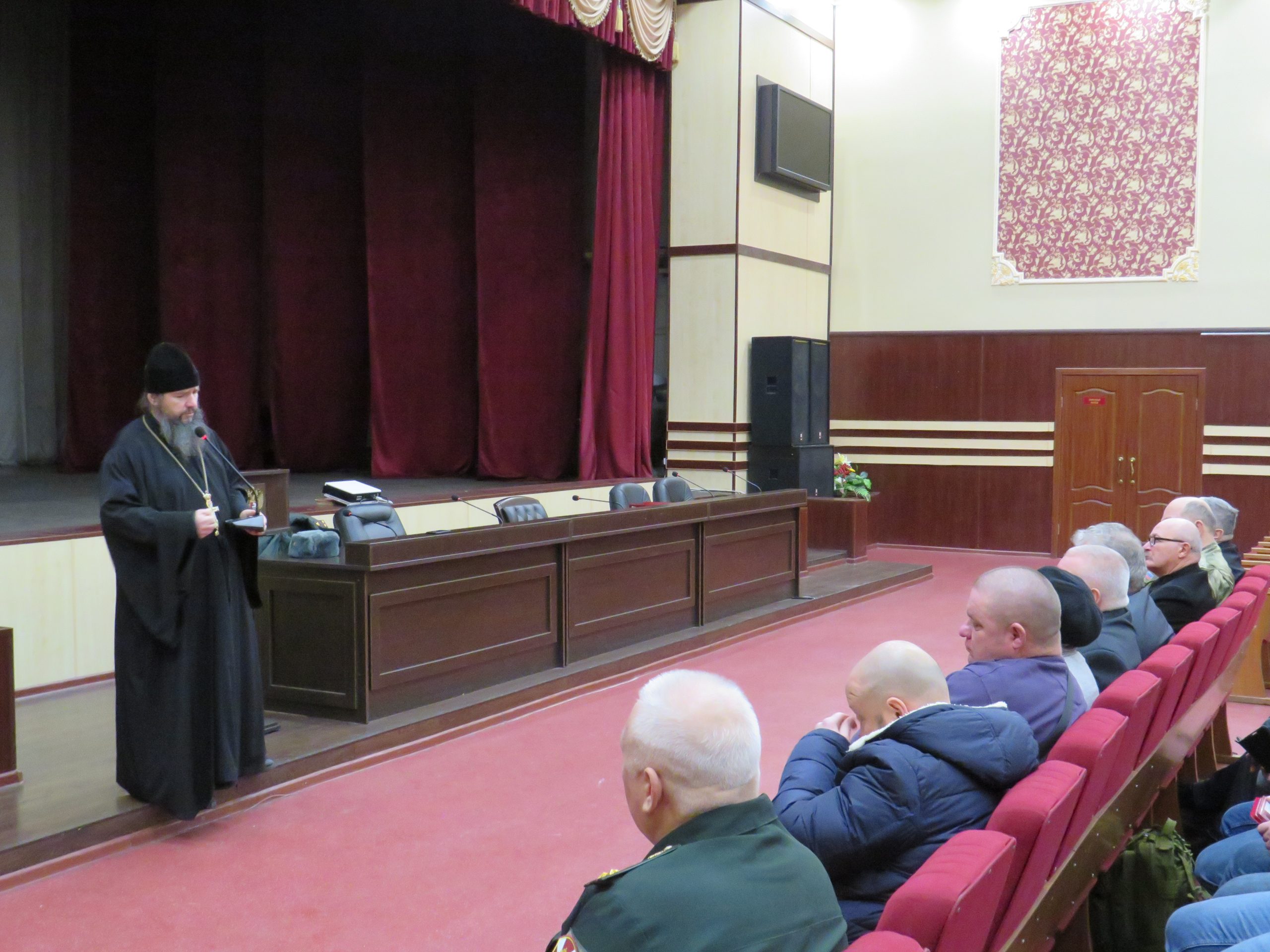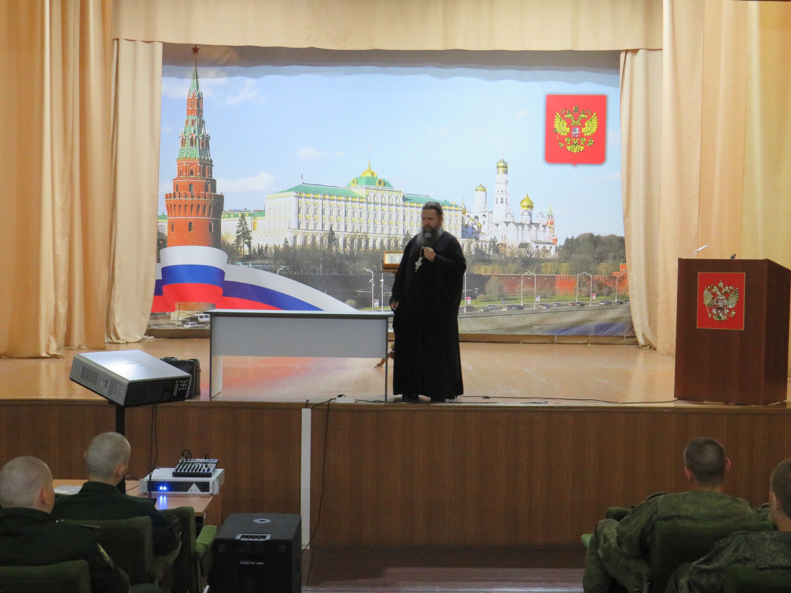 Священник представил защитникам Отечества, среди которых были военнослужащие разных категорий, учение Церкви о происхождении зла и ознакомил с различными способами преодоления греховных страстей и наклонностей. Отец Феофан привел воинам различные примеры из своего опыта, а также напомнил им о последствиях дисциплинарных проступков и правонарушений. Несомненно, выступление военного пастыря произвела на солдат и офицеров глубокое впечатление, и, что немало важно, воспринималась участниками встречи с большим вниманием. >>